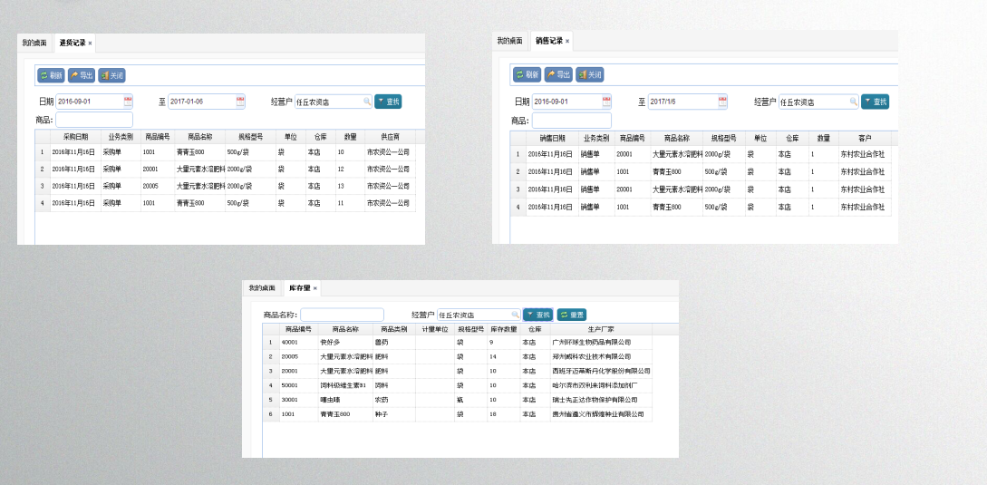 進(jìn)銷存臺(tái)賬管理系統(tǒng)能幫助農(nóng)資經(jīng)營(yíng)戶清楚統(tǒng)計(jì)農(nóng)資產(chǎn)品的進(jìn)貨、銷貨、存貨、以及資金往來(lái)賬目,一鍵統(tǒng)計(jì)各個(gè)相關(guān)的所有數(shù)據(jù),能很清晰的顯現(xiàn)出經(jīng)營(yíng)的所有情況。輕松的告別手工賬目,是一款真正的服務(wù)于農(nóng)資產(chǎn)品經(jīng)營(yíng)戶的貼身小管家。 雙擊經(jīng)營(yíng)戶名稱可進(jìn)入該經(jīng)營(yíng)戶的監(jiān)管界面,查看該經(jīng)營(yíng)戶的銷貨記錄、進(jìn)貨記錄和庫(kù)存量。